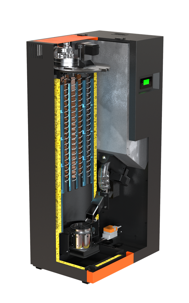 Výkon, emisie, účinnosť, automatizácia, spľahlivosť, všestrannost. Je vyrobený najmodernejšou technikou zvárania kotlového plechu. Integrovaný zásobník dáva kotlu unikátny vzhľad. Malá šírka kotla povolí montáž aj v miestnosti s úzkou zárubňou.