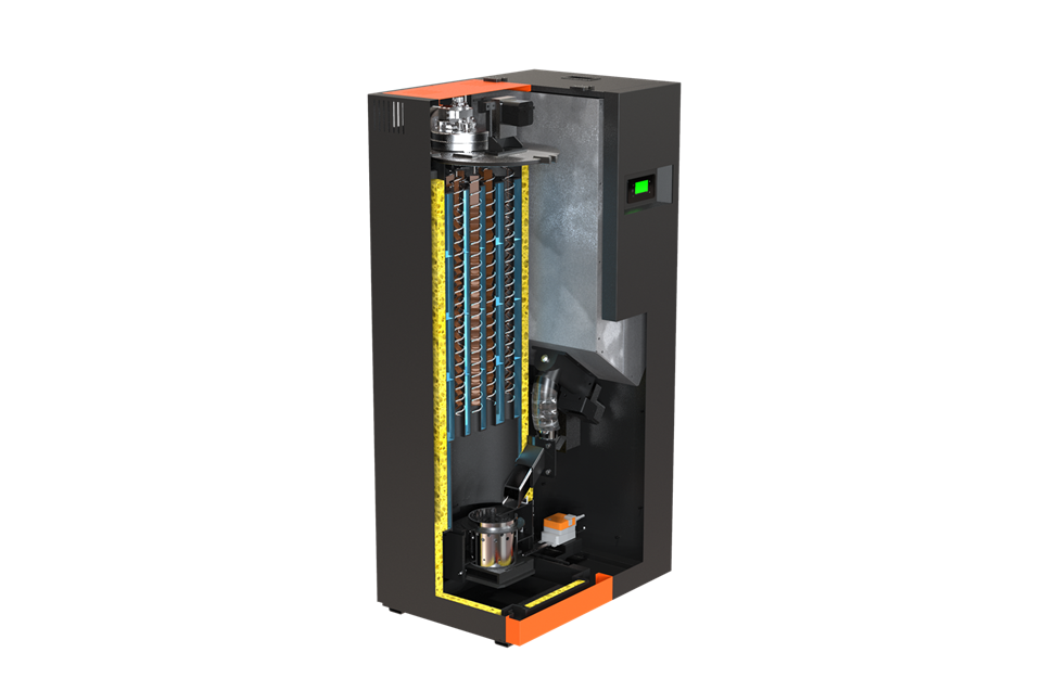 Výkon, emisie, účinnosť, automatizácia, spľahlivosť, všestrannost. Je vyrobený najmodernejšou technikou zvárania kotlového plechu. Integrovaný zásobník dáva kotlu unikátny vzhľad. Malá šírka kotla povolí montáž aj v miestnosti s úzkou zárubňou.