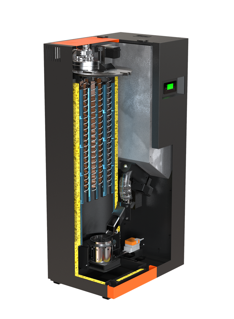 Výkon, emisie, účinnosť, automatizácia, spoľahlivosť, všestrannosť. Je vyrobený najmodernejšou technikou zvárania kotlového plechu. Integrovaný zásobník dáva kotlu unikátny vzhľad. Malá šírka kotla povolí montáž aj v miestnosti s úzkou zárubňou.