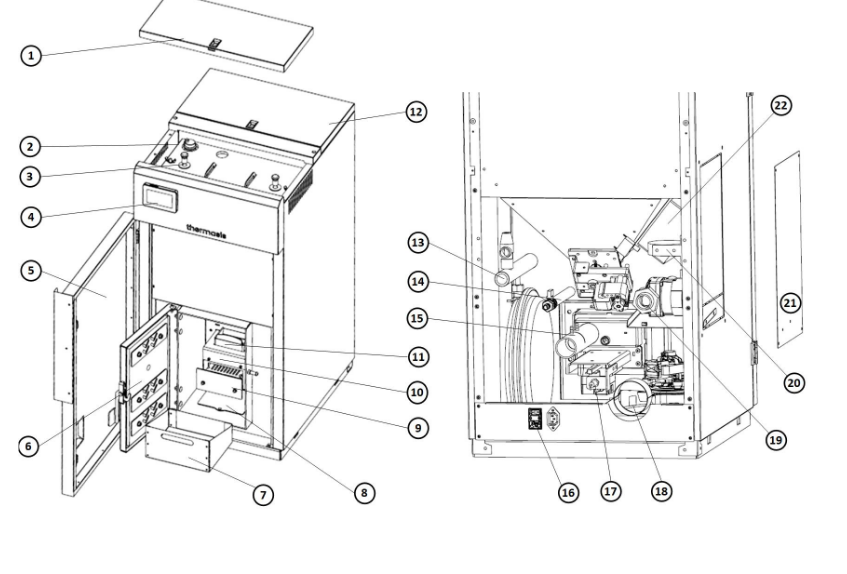 | 1. Kryt na čistenie výmenníka tepla | 12. Kryt nakladania paliva |