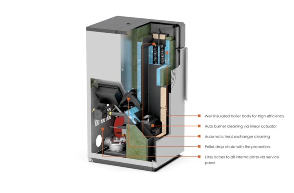 - Výkon, emisie, účinnosť, automatizácia, spľahlivosť, všestrannost. Je vyrobený najmodernejšou technikou zvárania kotlového plechu. Integrovaný zásobník dáva kotlu unikátny vzhľad. Malá šírka kotla povolí montáž aj v miestnosti s úzkou zárubňou.