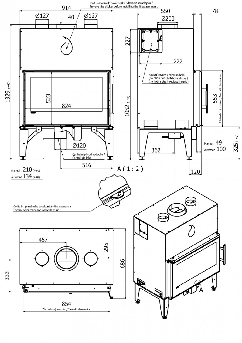 Manuálna regulácia je riadená presným ovládacím prvkom, ktorý je nastavený tak, aby regulácia bola čo najjednoduchšia. Rozdiel medzi otvoreným a zatvoreným ovládaním je tak veľmi účinný a na prvý pohľad rýchlo a jasne viditeľný. Nerezové ovládanie je priamo na krbovej vložke. Pomocou ovládača prívodu vzduchov si sami nastavíte optimálny výkon. Ovládač je veľmi jednoducho ovládateľný a nepôsobí rušivo.