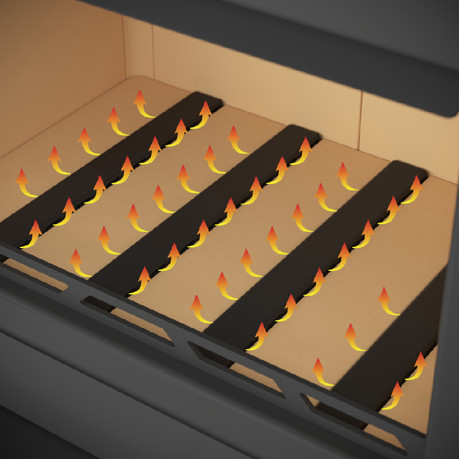 Revolučné riešenie spaľovacej komory ponúka neprekonateľný zážitok z ohňa. Drevo horí po celej ploche dna, vďaka systému bezroštového spaľovania a systému kanálikov na prívod vzduchu. Výsledkom je minimálna spotreba paliva. Pohľad do ohňa bol povýšný na novú úroveň. Ohnisko je z vermikulitu.