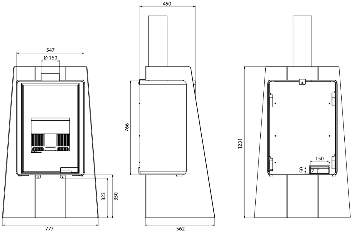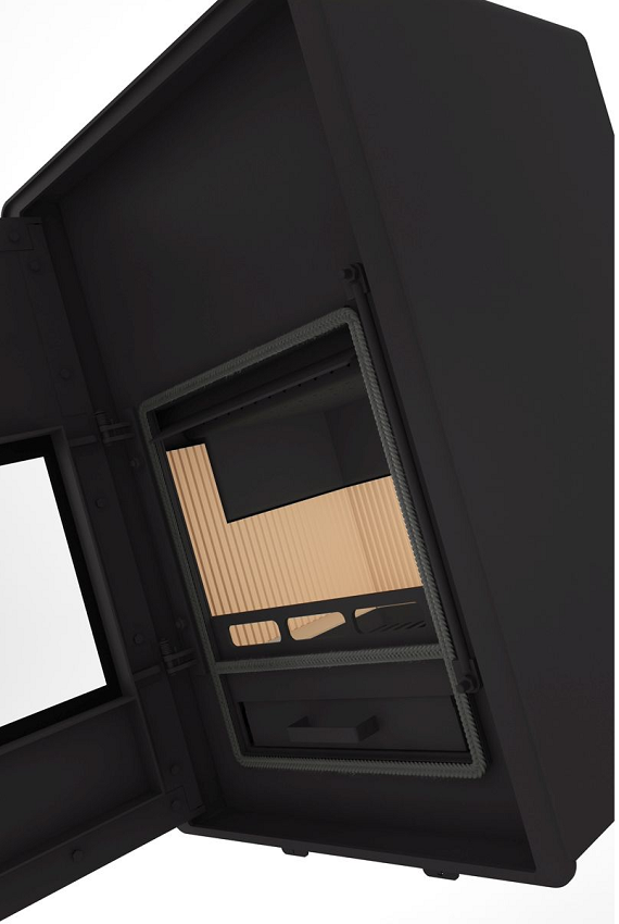 Kachle sú zvarené z oceľových plechov hrúbky 2 – 5 mm. V strednej časti kachlí je spaľovacia komora, ktorej čelná strana je tvorená prikladacími dvierkami. V dvierkach je usadené veľkoplošné špeciálne sklo, ktoré odoláva vysokým teplotám až 800 °C. Spaľovací priestor je obložený vermikulitovými tvarovkami. Tvarovky nie sú spojené žiadnou výmazovou hmotou. Na dne spaľovacej komory je liatinový rošt. Pred roštom je umiestnená zábrana proti vypadávaniu paliva a jeho zosúvaniu na čelné sklo. Kachle sú riešené ako dvojplášťové s vertikálnym odvodom spalín. Priemer dymovodu je 150 mm. Opláštenie kachlí je vyhotovené z oceľového plechu.