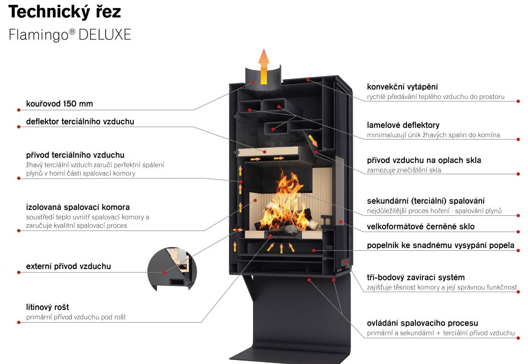 - je unikátny v tom, ako vás bude počúvať. Regulácia intenzity ohňa je domyslená do detailu a preto môžete v krátkom okamihu kachle stlmiť a rovnako rýchlo naštartovať ich horenie. Pri tlmenom režime môžete sledovať tancujúci oheň, ktorý bude pastvou pre vaše oči. Podstata horenia kachlí Flamingo DELUXE je založená na spaľovaní plynných častíc, ktoré vytvára neopakovateľnú atmosféru, a Vy budete jej súčasťou.