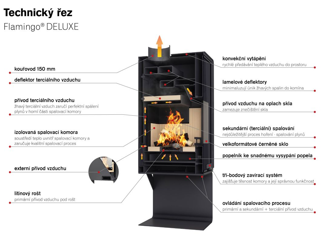 Prívod sekundárneho a terciálného vzduchu, ktorý je regulovateľný, skvalitňuje ako spaľovanie, tak aj napomáha k samočinnému čisteniu skla dvierok. Pri správnom množstve a pomere vzduchov privedených do miest spaľovacej komory sa účinnosť spaľovania zvýši a tým sa znižuje emisia škodlivých plynov do ovzdušia.