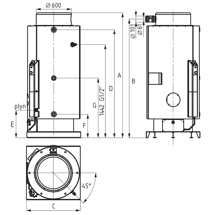 | Typ | Rozmer A (mm) | Rozmer B (mm) | Rozmer C (mm) | Rozmer D (mm) | Rozmer E (mm) | Rozmer F (mm) | Rozmer G (mm) | Pripojenie vody | Pripojenie plynu | Priemer odťahu spalín (mm) | Hmotnosť (kg) |