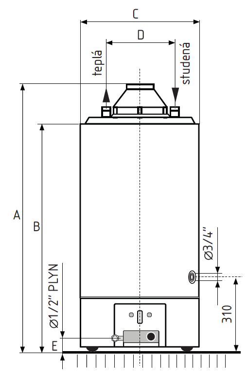 | TYP ohrievača | Rozmer A (MM) | Rozmer B (MM) | Rozmer C (MM) | Rozmer D (MM) | Rozmer E (MM) | Pripojenie vody Vstup/Výstup | Pripojenie plynu | Prieťah odťahu spalín (MM) | Hmotnosť (Kg) |